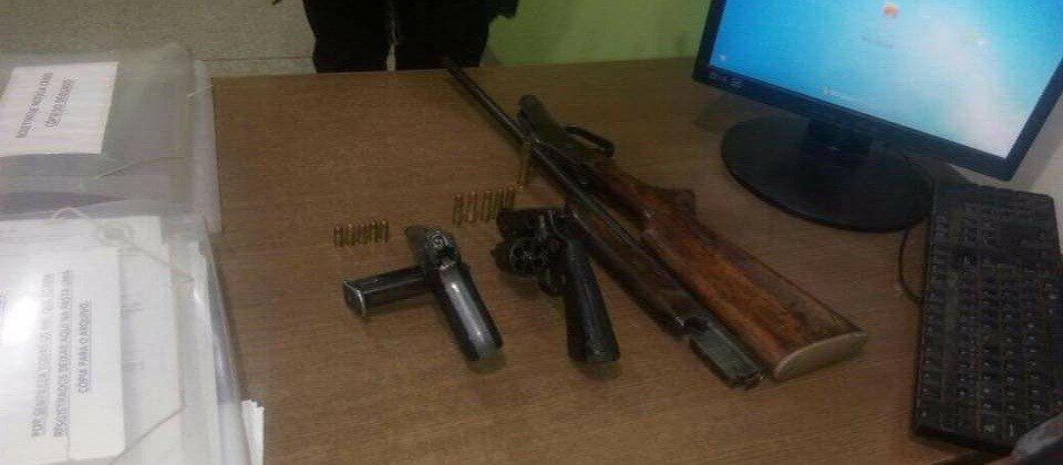 Nas buscas no interior do automóvel foram localizadas três armas de fogo, sendo um revólver, uma pistola e uma espingarda, além de uma touca tipo “ninja” e carne de caça.