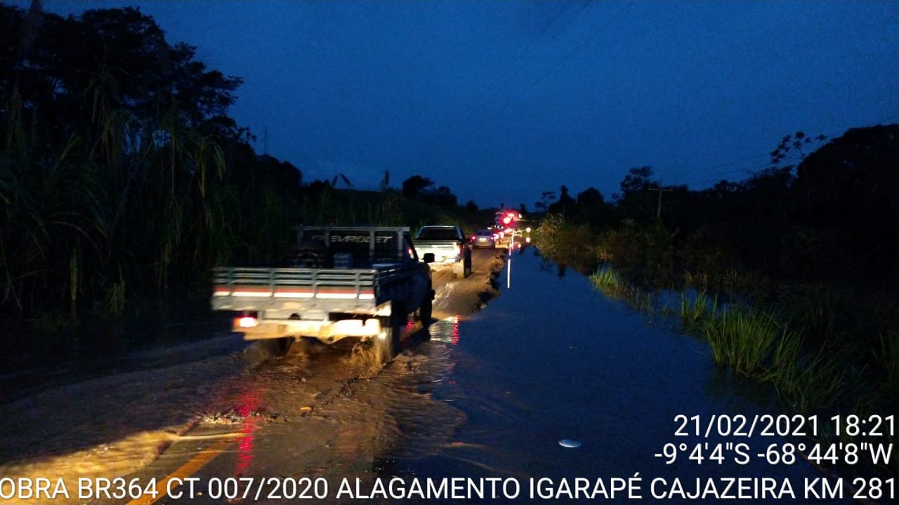 No início da noite deste domingo, 21, o Departamento Nacional de Infraestrutura de Transportes (DNIT) anunciou que a BR-364 está com tráfego liberado. Equipes do DNIT trabalharam praticamente dois dias de forma ininterrupta e a obra de elevação da pista só parou por falta de pedras.