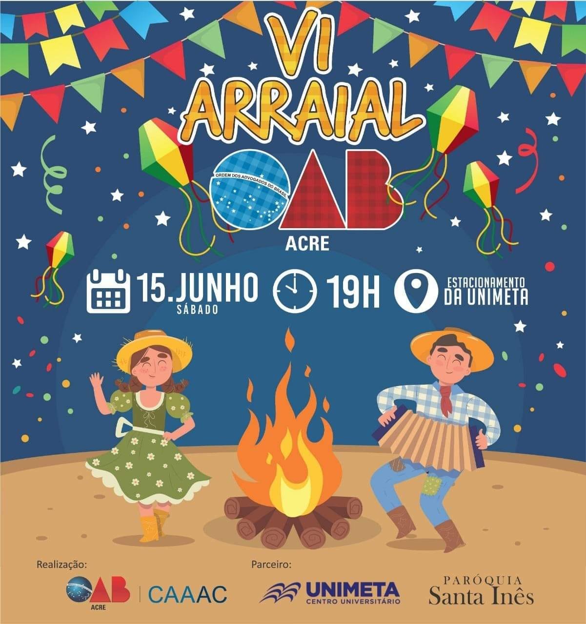 Diversão e festa. Essa é a promessa da edição de 2019 do Arraial da Ordem dos Advogados do Brasil seccional Acre (OAB/AC) neste sábado, 15, no estacionamento do Centro Universitário Unimeta, em Rio Branco, a partir das 19h. O evento, que terá entrada gratuita e será aberto ao público, é uma forma de confraternização da advocacia acreana e oportuniza maior aproximação dos advogados. O evento é realizado entre a OAB/AC e a Caixa de Assistência aos Advogados do Acre (CAA/AC).