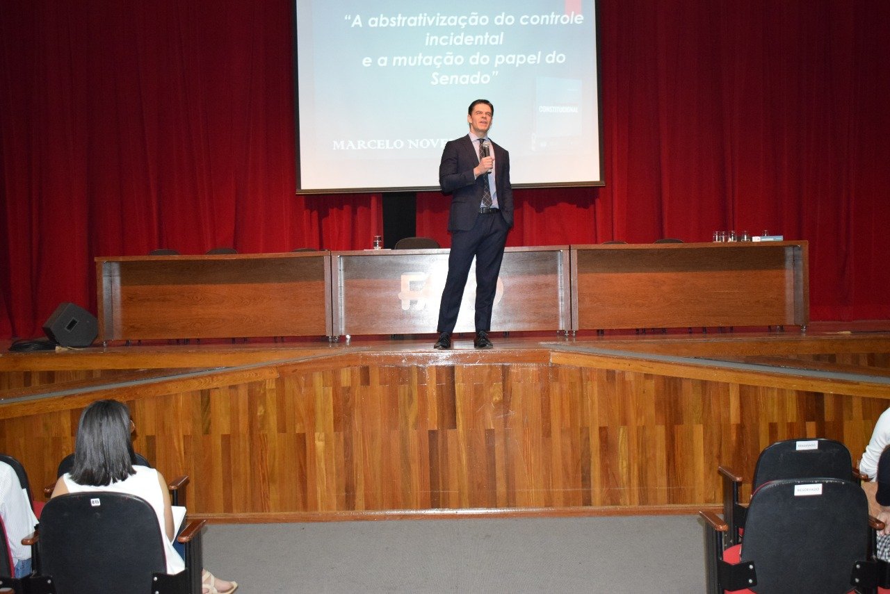 Durante o dia, Novelino discorreu sobre o tema “Curso Jurisdição Constitucional e Segurança Jurídica” e no período da noite, na faculdade, contando com a participação da classe jurídica, ele abordou o tema “A abstrativização do controle incidental e a mutação do papel do Senado”.