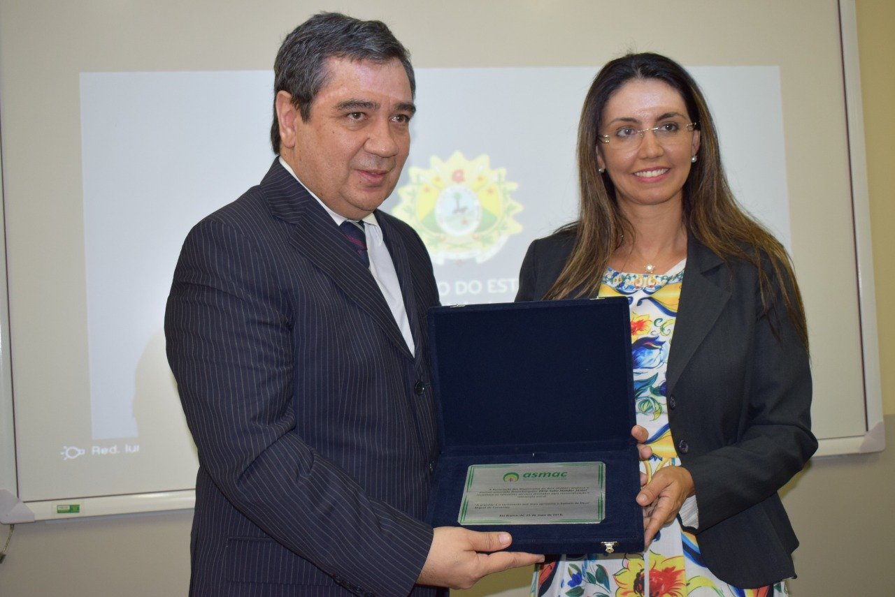 A diretora da Associação dos Magistrados do Acre (Asmac), Andrea Brito, homenageou na manhã desta sexta-feira (25/05) os juízes Marcelo Coelho e Maha Manasfi e o desembargador Elcio Sabo Mendes. Eles receberem uma placa em que comemora os longos serviços prestados na busca pelo tratamento digno aos apenados por meio da oferta de penas alternativas objetivando a ressocialização e a redução da reincidência.
