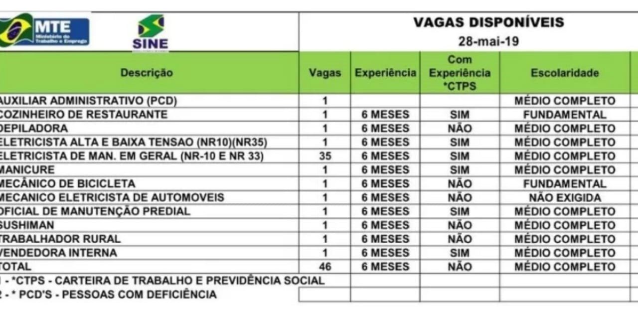 São mais 46 vagas de emprego que o Sistema Nacional de Emprego do Acre (Sine) está oferecendo nesta terça-feira, 28, em Rio Branco. Os interessados em diversas áreas, devem ir até a OCA, centro da cidade.