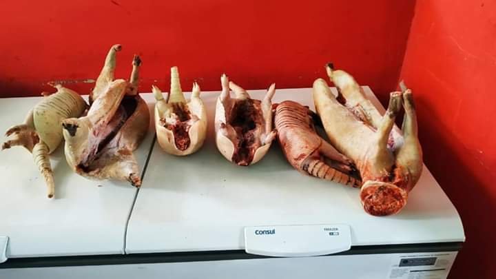 Uma guarnição do Batalhão de Policiamento Ambiental (BPA) apreendeu na tarde desta segunda-feira, 08 de julho, carne de animal silvestre, sendo 04 tatus e 02 pacas, em um estabelecimento comercial da capital.