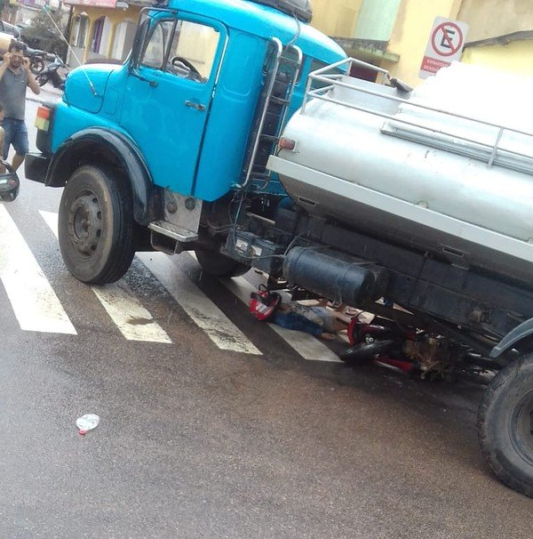 Uma mulher foi parar embaixo de um carro-pipa durante um acidente no início da tarde deste sábado (12), na Estrada São Francisco, em Rio Branco. A vítima estava em uma motocicleta e sobreviveu.