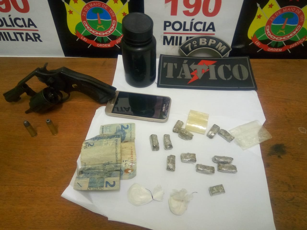 A GUARNIÇÃO DO TÁTICO em ação fazendo abordagens e entrada nos becos e nas ‘bocadas’ avistou um indivíduo que ao perceber a presença da PM quis se evadir jogando fora uma arma de fogo tipo revólver calibre 38, 12 tabletes de maconha e 02 invólucros de cocaína.