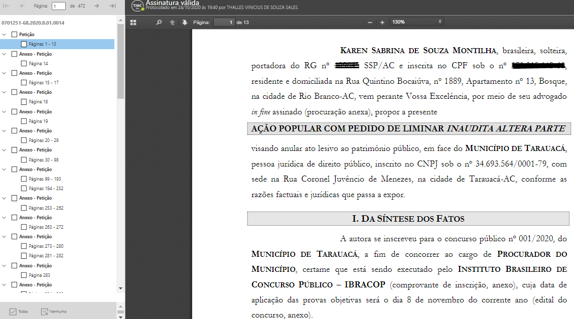 Semana passada, dia 24/10/2020, a advogada Karen Sabrina de Souza Montilha, através do Dr. Thalles Vinicius de Souza Sales, ajuizaram a Ação Popular com Pedido de Liminar nº. 0701251-68.2020.8.01.0014, contra a Prefeitura de Tarauacá e o Instituto Brasileiro de Concurso Público – Ibracop, requerendo a “imediata suspensão do concurso”.