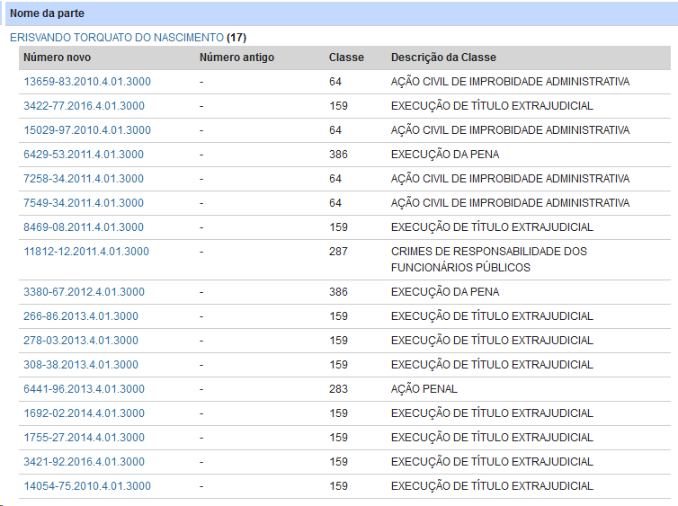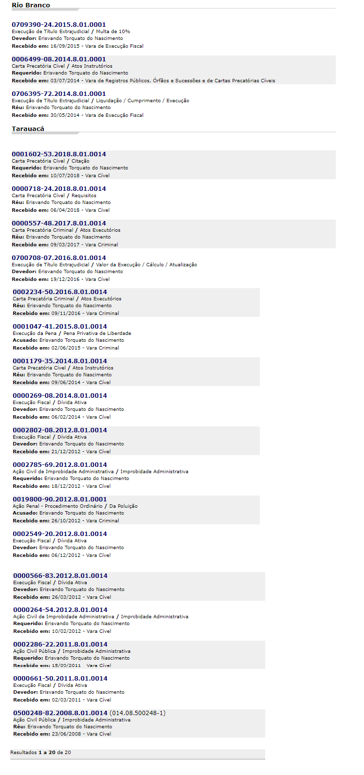 Na Justiça Estadual, tramitam em desfavor de Torquato aproximadamente 20 processos, incluindo execução de pena, execução de dívida ativa, Ação Civil de Improbidade Administrativa, dentre outras.