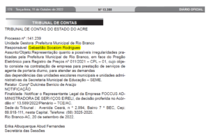 O Tribunal de Contas do Acre – TCE, publicou nesta terça-feira, 11, no Diário Oficial do Estado, uma notificação endereçada ao Representante Legal da Empresa FOCCUS ADMINISTRADORA DE SERVIÇOS EIRELI, da decisão proferida no Acórdão n° 13.589/2022/Plenário – TCE/AC.