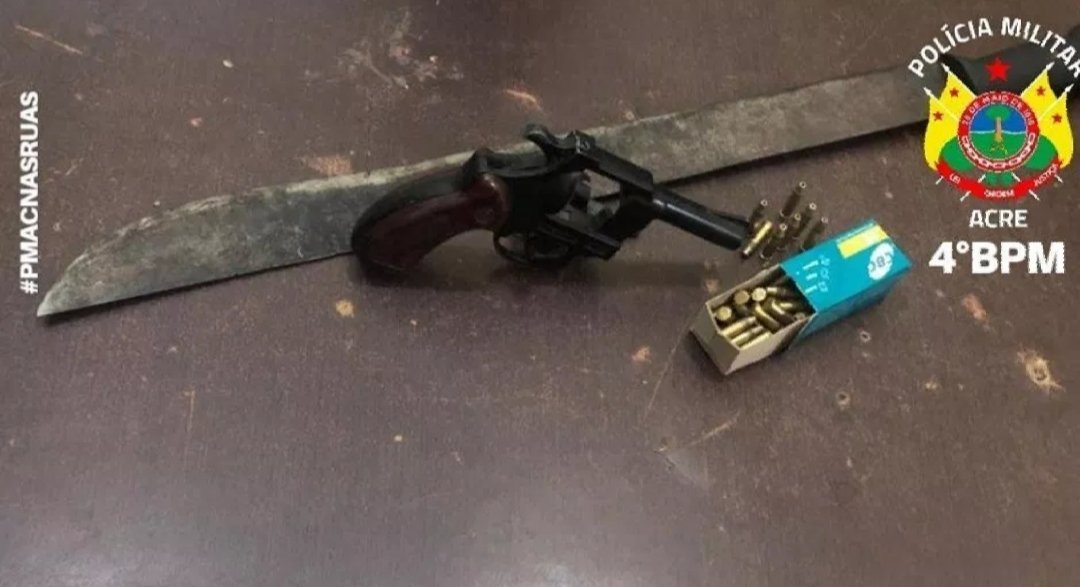 Um homem ameaçava o próprio irmão com um terçado quando a Polícia Militar o abordou no bairro Floresta, em Rio Branco. Na revista, os PMs acabaram encontrando uma arma de fogo municiada.