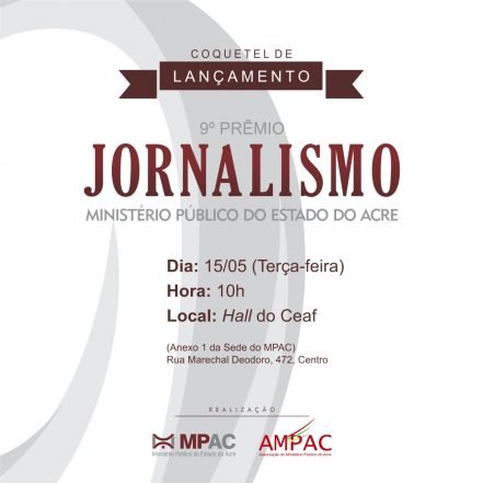 Faltam quatro dias para o início oficial da disputa pelo Prêmio de Jornalismo do Ministério Público do Estado do Acre (MPAC) deste ano. Isso porque o coquetel de lançamento da sua 9ª edição será realizado nesta terça-feira (15), às 10h da manhã, no anexo I do edifício-sede do MPAC.