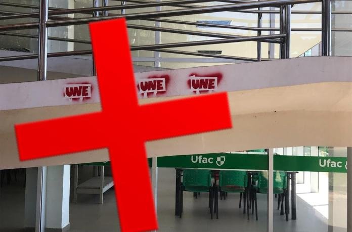 Imagens publicadas nas redes sociais e enviadas ao Alerta Acre mostram uma coluna de um bloco e a rampa ao segundo andar do Restaurante Universitário (RU) da UFAC pichados com dizeres que se referem à União Nacional dos Estudantes (UNE).