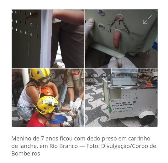 Um menino de 7 anos ficou quase uma hora com o dedo preso no carrinho de lanche da mãe e precisou ser socorrido pelo Corpo de Bombeiros. O caso ocorreu na tarde deste domingo (27), no bairro da Paz, em Rio Branco.