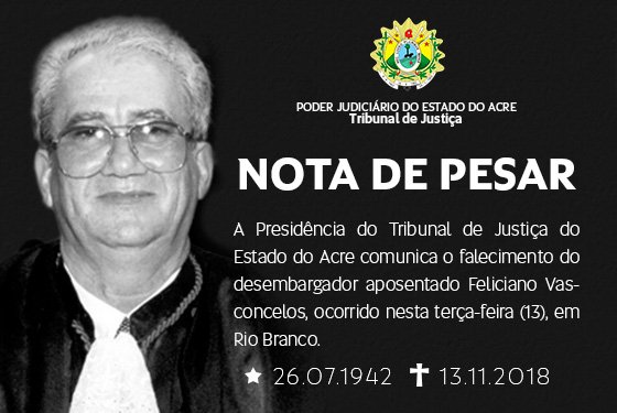 A presidente do Tribunal de Justiça do Estado do Acre (TJAC), desembargadora Denise Bonfim, comunica à classe forense e à comunidade em geral o falecimento do desembargador aposentado Feliciano Vasconcelos de Oliveira.