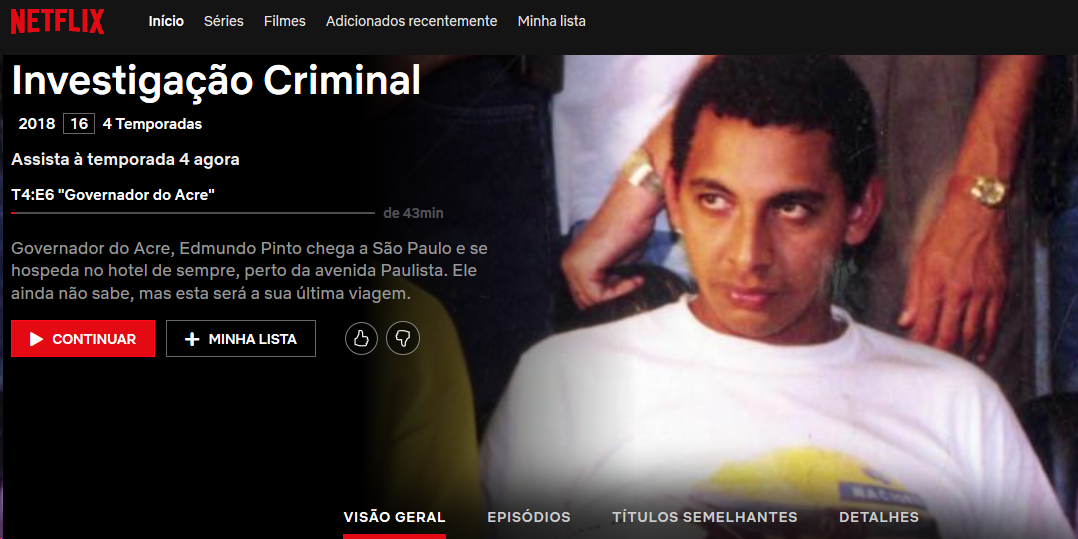 O caso levado ao ar, na quarta temporada, é o de Edmundo Pinto, que ocupava o cargo de governador do Acre, quando foi morto, em 1992, após ‘ser assaltado em um hotel’ em São Paulo, disse a polícia civil do estado.