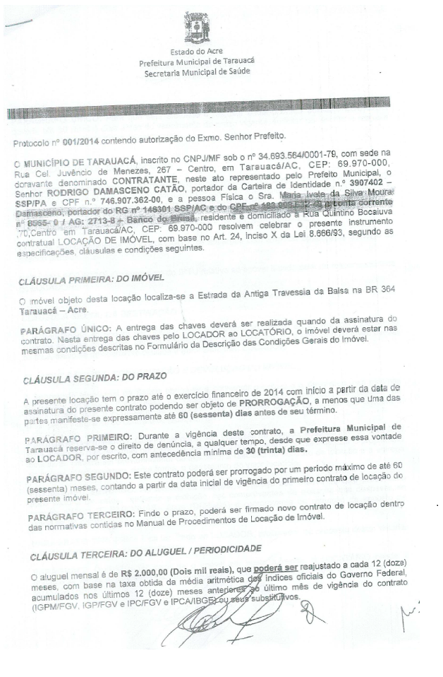 O contrato de locação foi assinado no dia 06/05/2014, e nele constam as assinaturas do ex-prefeito de Tarauacá, Sr. Rodrigo Damasceno Catão, o ex-secretário municipal de saúde, Sr. Carlos Tadeu Lopes da Silva, e a locadora Sra. Maria Ivete Damasceno.