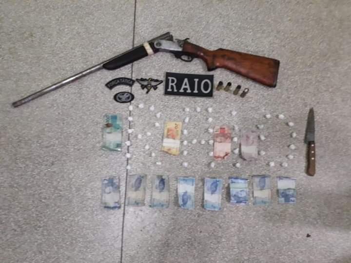 A primeira arma foi apreendida no bairro Lagoa, em Cruzeiro do Sul, quando uma equipe das Rondas de Ações Intensivas e Ostensivas (Raio), após abordagem encontrou uma espingarda calibre 24, além de 46 papelotes de cocaína, com uma dupla.