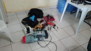 O veículo Golf, de cor vermelha, placa NBG6446, foi apreendido nas imediações e, no local do crime, os materiais utilizados na tentativa de furto: uma furadeira industrial de alto impacto com várias brocas, uma furadeira profissional, uma esmerilhadeira, um transformador de 5 mil whats, dois alicates, entre outros itens. Os policiais entraram em contato com o gerente da agência, segundo o qual, aparentemente, nada havia sido levado e que uma equipe da empresa faria a perícia no local.