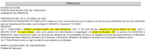 Na última terça-feira, 05, a prefeitura do município de Tarauacá, publicou no Diário Oficial do Estado a Ata de Transmissão do Cargo de Prefeita. De acordo com o documento, a prefeita Maria Lucineia Nery de Lima Menezes (PDT), esposa do deputado Jesus Sérgio (PDT), viajou para Brasília-DF, e transmitiu o cargo para seu vice, RAIMUNDO MARANGUAPE DE BRITO (PSD), que passou imediatamente a exercer o cargo de prefeito desde domingo, dia 03, devido a viagem da titular (veja clique aqui).