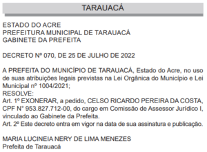 A exoneração foi publicada através do Decreto nº. 064, de 11/07/22, no Diário Oficial do Estado – DOE, edição nº. 13.324, fls. 188, desta terça-feira, 12.