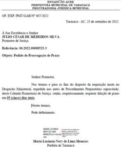 O MP havia concedido o prazo de 24horas à prefeitura de Tarauacá para apresentar documentos e informações. A notificação do MP foi expedida dia 22/09/2022, às 19:27 horas, por meio eletrônico. O prazo terminou no final de semana.