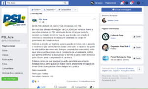 Em vista das últimas informações VEICULADAS por variadas fontes a executiva estadual do PSL informa de forma oficial que nada foi decidido ou tratado dentro ou fora de sua direção com relação à renúncia ou desistência de nosso pré-candidato ao cargo de governador do Estado do Acre.