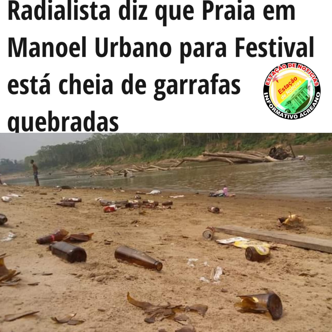 O radialista Gilmar Mendes Lima, da cidade de Manoel Urbano, fez uma postagem no facebook, informando que a Praia do referido município, onde ocorrerá o Festival de Praia, está cheia de garrafas quebradas, colocando em risco a integridade física dos banhistas.
