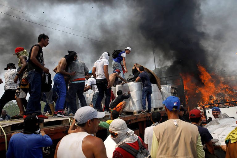 Foto de capa: Pessoas retiram suprimentos de caminhão incendiado na ponte Santander, entre Colômbia e Venezuela.