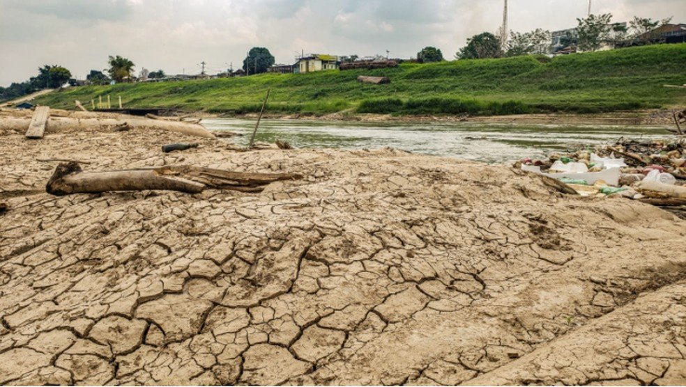 Arquivo pessoalCom nível baixo, lixo fica acumulado às margens do rio — Foto: Juan Diaz/