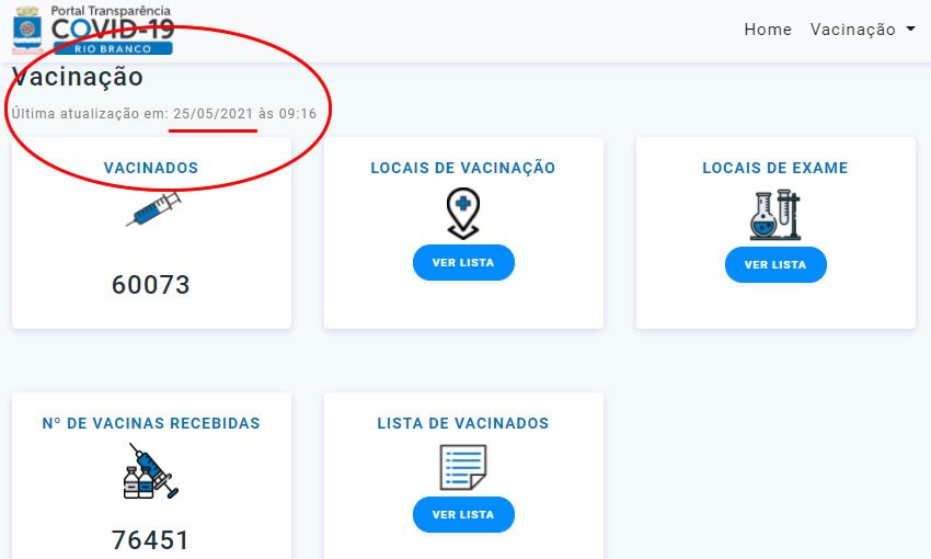 Há exatos 13 dias, a Saúde Municipal de Rio Branco não atualiza o Portal da Transparência da Covid-19 em relação ao recebimento de vacinas e aplicação do imunizante na capital. Desde o dia 25 de maio, a pasta conta com 60073 de vacinados, e 76451 de vacinas recebidas.