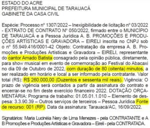 Show de Amado Batista estima-se que será pago com Recurso Próprio – RP, e não dinheiro de repasse ou convênio com Governo do Acre, como informou a prefeitura.