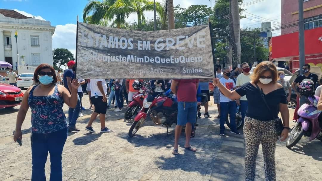 Os manifestantes se reuniram no estacionamento da Arena Acreana e fizeram um buzinaço em direção à Casa Civil para cobrar da equipe econômica a retomada das negociações da data-base, emperrada desde o ano passado.