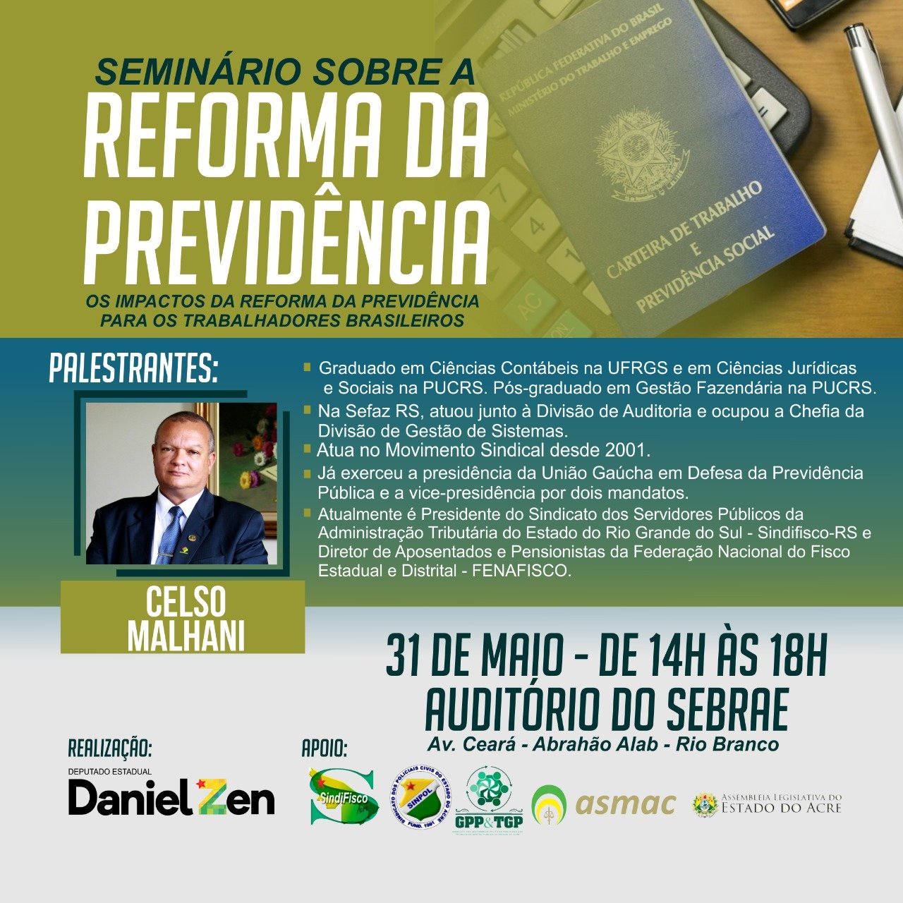 O Sindicato Estadual do Fisco do Acre (Sindifisco/AC) promove no dia 31 deste mês, sexta-feira, o Seminário Reforma da Previdência: Os Impactos para os Trabalhadores Brasileiros. A ação, feita em parceria com diversas outras entidades sindicais, será realizada no Auditório do Serviço de Apoio às Micro e Pequenas Empresas no Acre (Sebrae no Acre) das 14h às 18h e debaterá os diversos aspectos do tema. As inscrições estão abertas desde quinta-feira, 23.