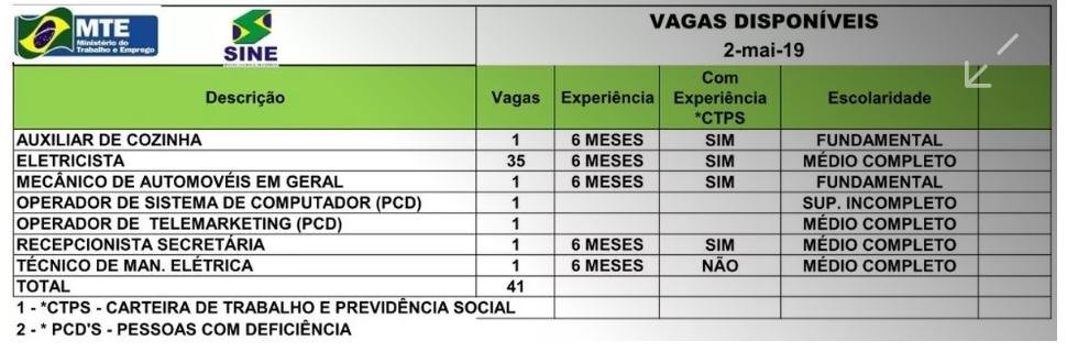 As vagas são rotativas, ou seja, são disponibilizadas para o dia, podendo não estar mais disponíveis para o dia seguinte. O Sine se responsabiliza por encaminhar cinco pessoas, no perfil solicitado pelo empregador, para que ele possa escolher qual vai preencher a vaga. O cidadão pode verificar se a vaga ainda está disponível através do telefone 0800 647 8182