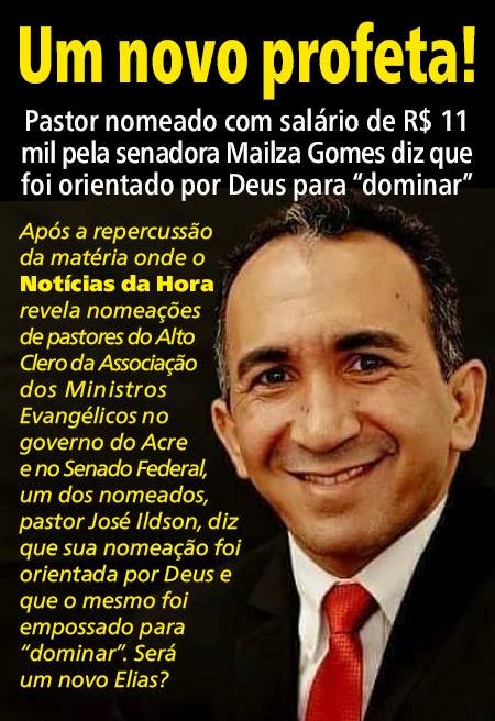 Após a repercussão da matéria onde o Notícias da Hora revela nomeações de pastores do Alto Clero da Associação dos Ministros Evangélicos no governo do Acre e no Senado Federal, um dos nomeados, pastor José Ildson, diz que sua nomeação foi orientada por Deus e que o mesmo foi empossado para “dominar”. Será um novo Elias?