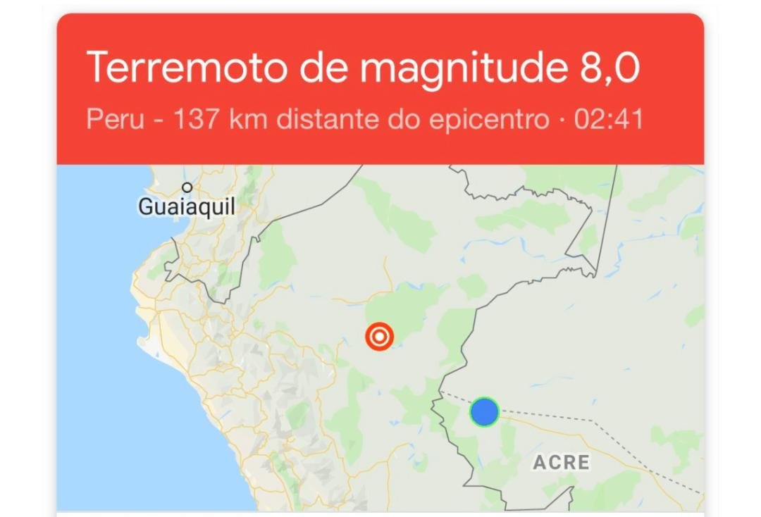 Os moradores de Cruzeiro do Sul e municípios vizinhos, no interior do Acre, sentiram um forte terremoto na madrugada deste domingo (26), que, de acordo com Serviço Geológico, chegou a magnitude 8,0.