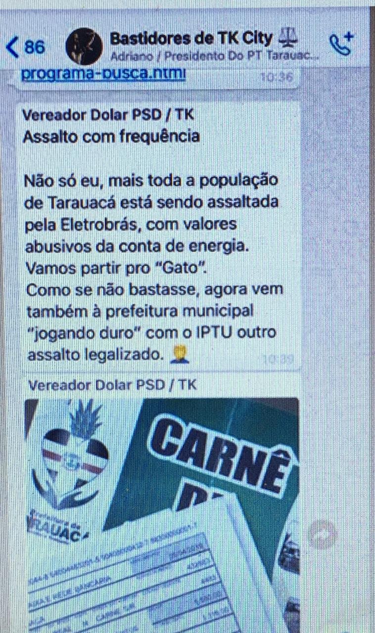 No município de Tarauacá, distante mais de 400 km da capital, Rio Branco, o vereador Dolar, do PSD usou um grupo de WhatsApp intitulado “Bastidores de TK City” para protestar contra o aumento abusivo por parte da Energisa, empresa que comprou a Eletrobrás/Acre.