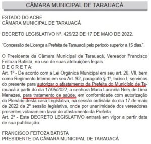 Segundo o texto publicado, os vereadores votaram favoráveis para “autorizar o afastamento da Prefeita do Município de Tarauacá à partir do dia 17/05/2022, a senhora Maria Lucinéia Nery de Lima Menezes, para tratamento de saúde, em conformidade com autorização do Plenário desta casa Legislativa, na sessão ordinária do dia 17 de maio de 2022 da 2º sessão legislativa, onde por unanimidade dos vereadores presentes votaram em favor do afastamento da Prefeita“.