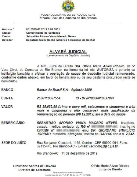 Nos próximos dias, Tião Viana poderá indicar bens passíveis de penhora pertencentes à Major Rocha, tendo em vista que a obrigação de pagar danos morais, supostamente não foi quitada na íntegra.